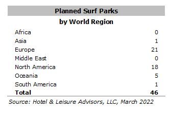 Surf parks have strong developer interest in North America and throughout the world. The following table shows the number of surf parks proposed or under construction . These do not include projects in very preliminary stages.